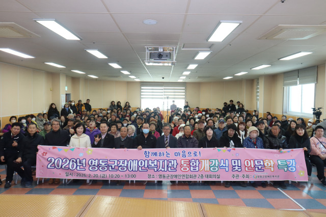 영동군장애인복지관(관장 박병규)은 2월 20일(금) 영동군장애인연합회관 2층 대강당에서 프로그램 이용인 200여 명과 지역사회 주요 인사가 참여한 가운데 ‘2026년 통합개강식 및 인문학 특강’을 성황리에 개최하였다.