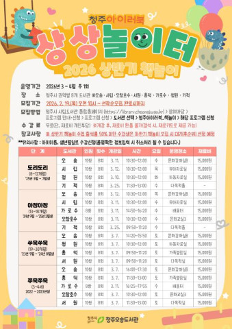 이 프로그램은 청주시 영유아 독서운동 사업의 일환으로, 그림책을 활용한 다양한 놀이 활동을 통해 아기와 양육자의 책에 대한 친밀감을 높이고, 상호 소통과 신체 발달을 지원한다. 프로그램 종료 후에는 동아리를 형성해 지속적인 공동육아 활동도 지원할 예정이다.
